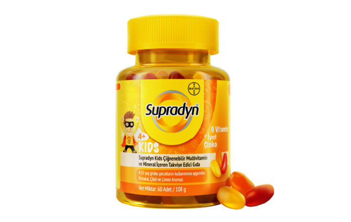 Supradyn Ailesi’nin merakla beklenen yeni üyesi Supradyn Kids, 9 vitamin (Vitamin C, Vitamin E, Vitamin B3 (Niasin), Biotin, Vitamin A, Vitamin B12, Vitamin D, Vitamin B6 (Pridoksin), Vitamin K), iyot ve çinko içeriyor. İyot, çocukların normal büyümesine katkıda bulunuyor.